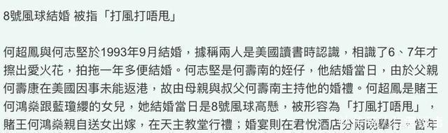 类似的还有 何超凤 ,她嫁给了知名马主何寿康的儿子何志坚。 两人在美国读书的时候就认识,同属一个社交圈,相识了六七年才擦出火花,恋爱不久就很快结婚。 在一个圈子里找合适的结婚对象,也很符合豪门的作风。